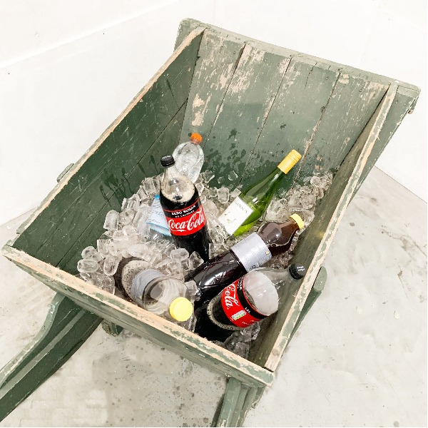 Zet naast de kruiwagen nog wat zinken teilen of een zinken badkuip neer en je hebt gelijk een tof self service station! Wil je er een gave eyecatcher van maken? Dan kun je bijvoorbeeld de kratjes wand achter de zinken teilen neer zetten. In de kratjes kun je dan nog wat drankjes kwijt, zet een paar van de teilen boven op, een aantal ervoor en wat deco items her en der en je hoekje is helemaal compleet!